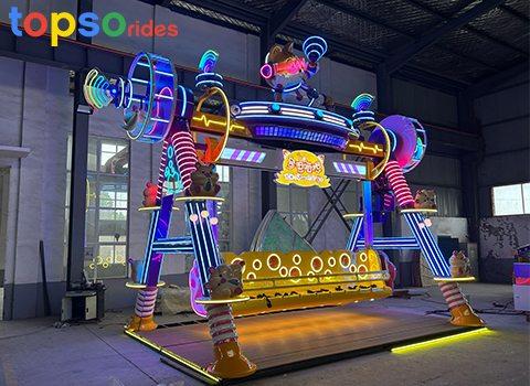 The overall color scheme of the Happy Swing Kids Ride is a cyberpunk neon hue, adorned with cartoon images of cats and hamsters, making it highly eye-catching. The cockpit is shaped like a long strip of cheese, painted in bright yellow, bringing a wonderful time on the ride.