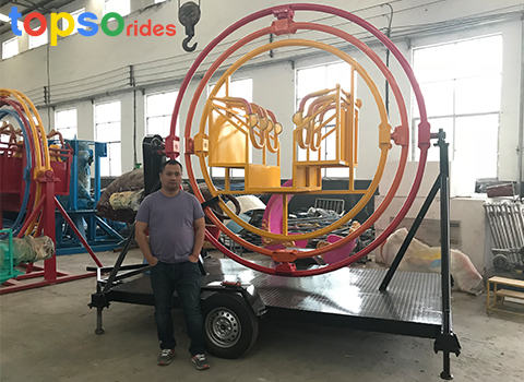 It can be 360 degree rotating, speed faster or slower,it will enable you to appreciate the special three dimensional feel free to rotate, relax muscles, both exercise and fun.Trailer mounted human gyroscope ride is suitable for suitable for investors who change venues.